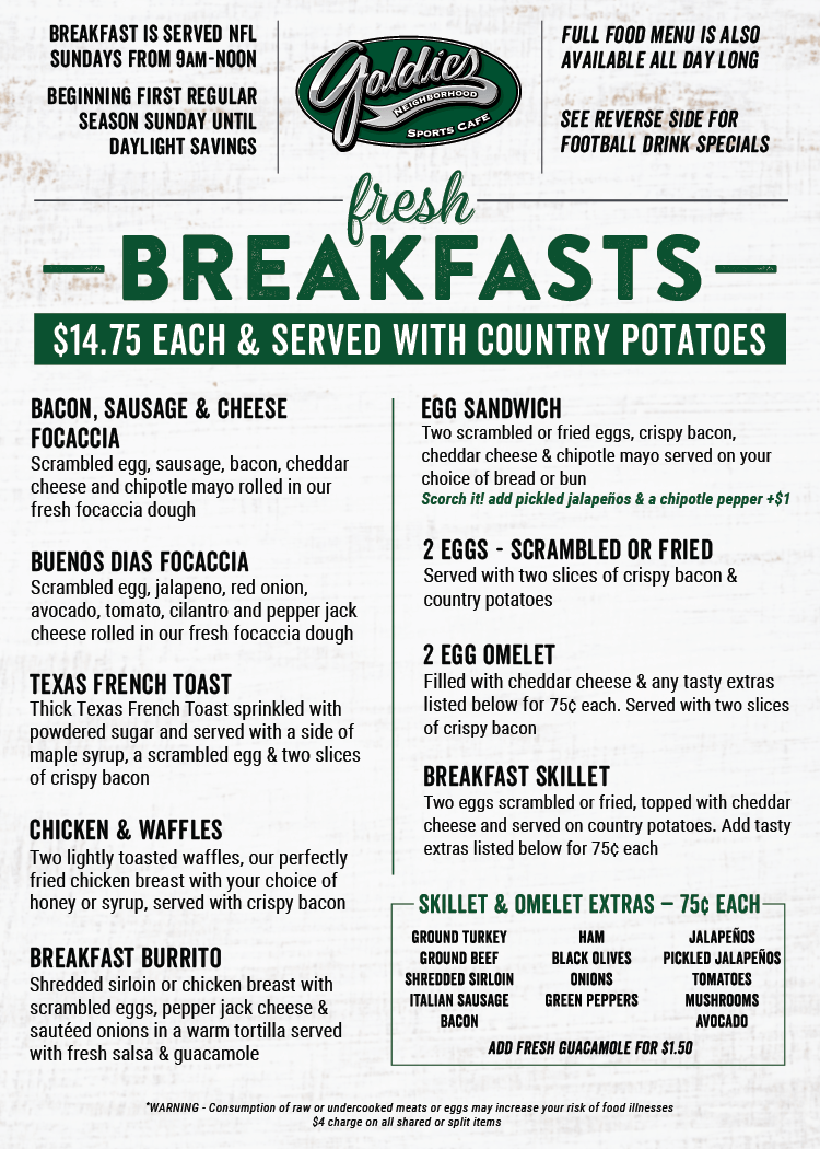 Food served until 11pm Sunday-Thursday, Midnight Friday & Saturday. Limit 3 Goldieritas per person.